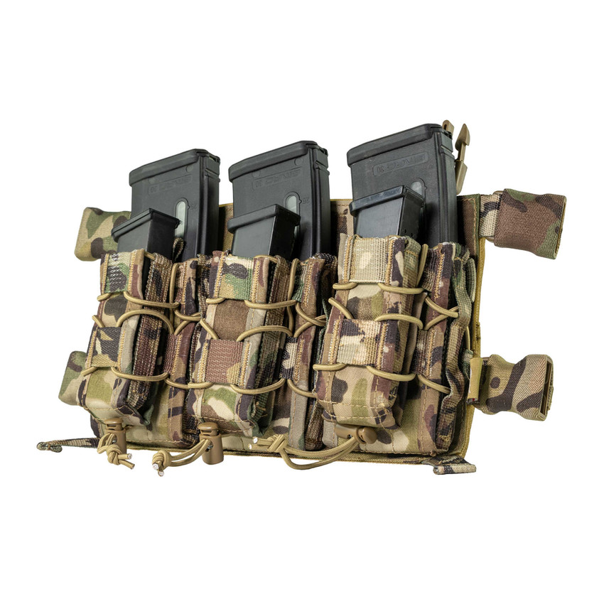 Featuring three front rifle magazine pouches and three front pistol magazine pouches, each capable of storing multiple magazines, the VX Buckle Up Mag Rig ensures fast and easy access to your gear. The rig is equipped with elastic bungee cords and cord locks, providing extra security to keep your magazines firmly in place during movement.